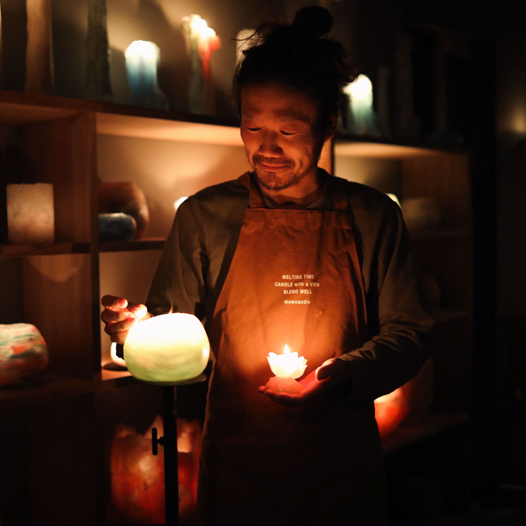 このキャンドルのこだわりは独自に調合した色味と、通常キャンドルの5倍以上の工数をかけて重ね合わせた数十層の色。火を灯すと、まるで太陽光が仁淀川に差し込んでいるかのような輝きが生まれます。お風呂上りや夜のくつろぎ時間に、このキャンドルで至福の時間を過ごしてみませんか?